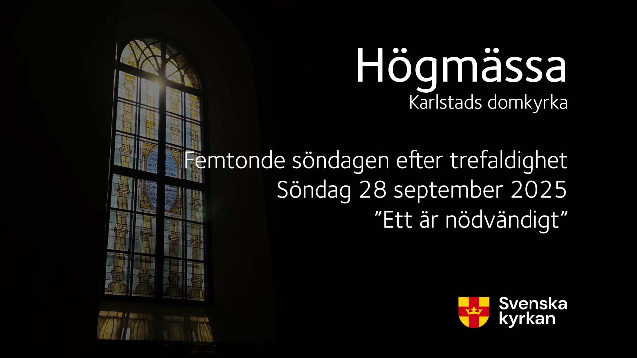 Högmässa på Femtonde söndagen efter trefaldighet, söndagen 28 september, från domkyrkan i Karlstad. Dagens rubrik: ”Ett är nödvändigt”. Medverkande: Domkyrkokaplan Anna Bohlin, domkyrkolektor Ewa Lindqvist Hotz, diakon Cecilia Hardestam, kantor Tomas Bergström, Katedralsångarna samt domkyrkans kyrkvärdar och kyrkvaktmästare.
