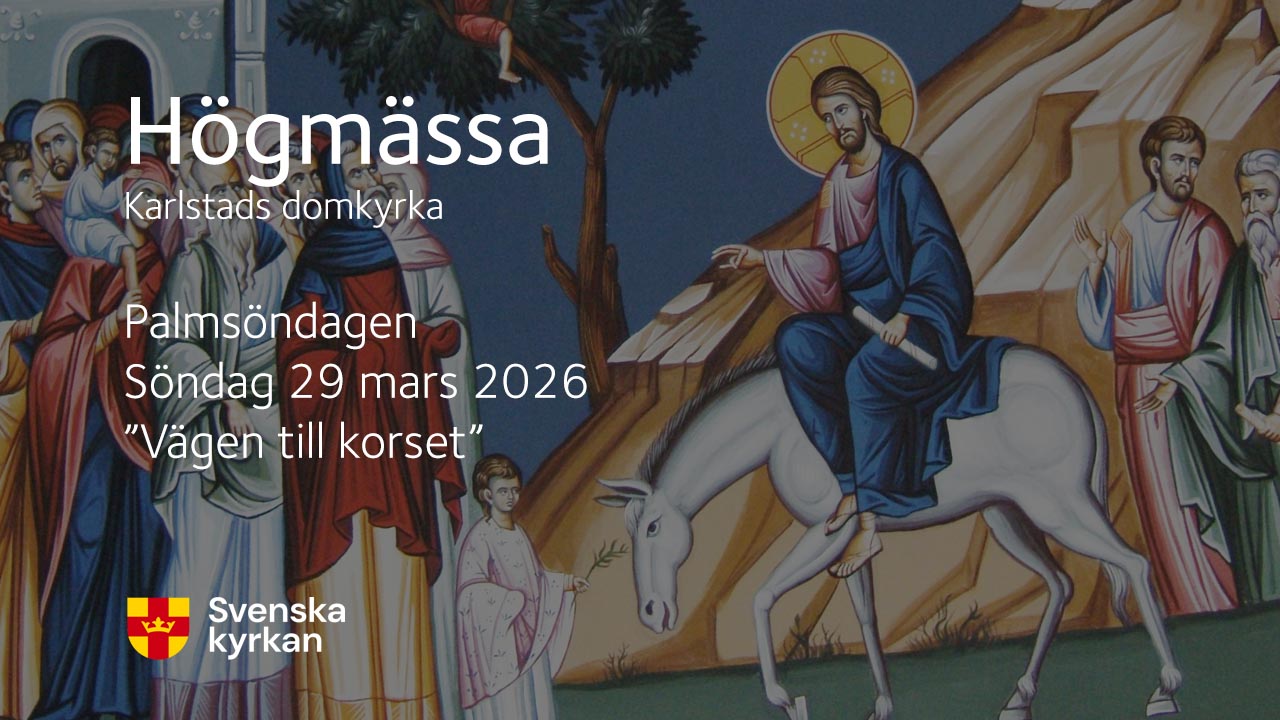 Högmässa på Palmsöndagen 29 mars, från domkyrkan i Karlstad. Dagens rubrik: ”Vägen till korset”. Medverkande: Domprost Dan Fredriksson, domkyrkokaplan Anna Bohlin, domkyrkolektor Ewa Lindqvist Hotz, diakon Miriam Pettersson, domkyrkoorganist Jörgen Martinson, Motettsällskapets seniorkör under ledning av Anne-Maia Ehne samt domkyrkans kyrkvärdar och kyrkvaktmästare.
