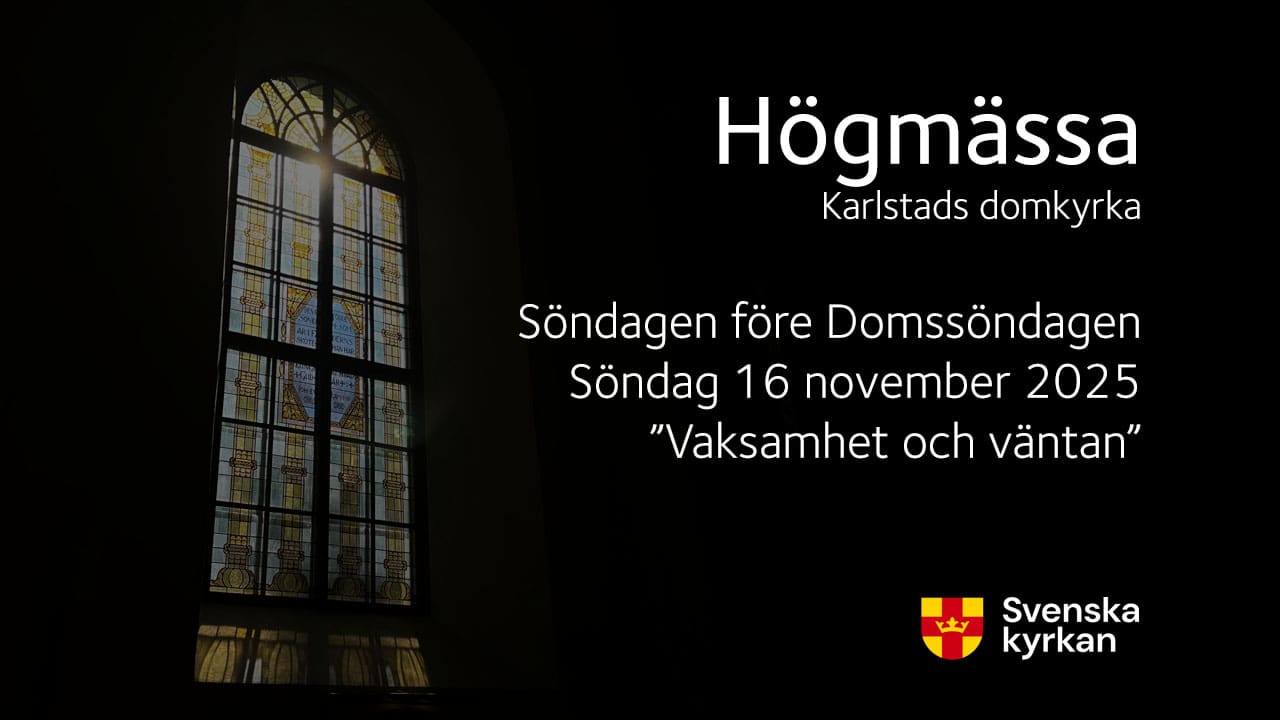 Högmässa på Söndagen före domssöndagen 16 november, från domkyrkan i Karlstad. Dagens rubrik: ”Vaksamhet och väntan”. Medverkande: Församlingsherde Johan Husberg, komminister Jonas Bodinger Larsson, diakon Miriam Pettersson, organist Unn Jörgensdotter Wing, Domkyrkans gosskör, domkyrkans barnkör Diskanten samt domkyrkans kyrkvärdar och kyrkvaktmästare.