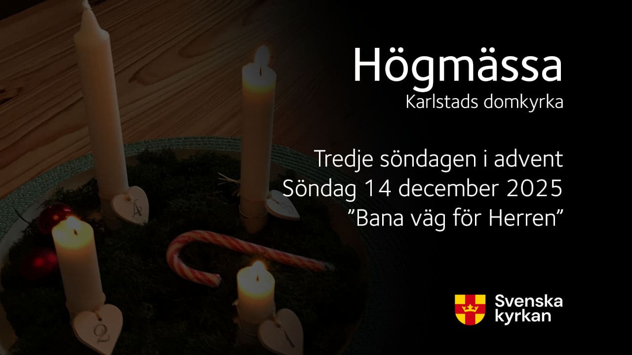 Högmässa på Tredje söndagen i advent 14 december, från domkyrkan i Karlstad. Dagens rubrik: ”Bana väg för Herren”. Medverkande: Domkyrkolektor Ewa Lindqvist Hotz, diakon My Andrén, kantor Tomas Bergström samt domkyrkans kyrkvärdar och kyrkvaktmästare.